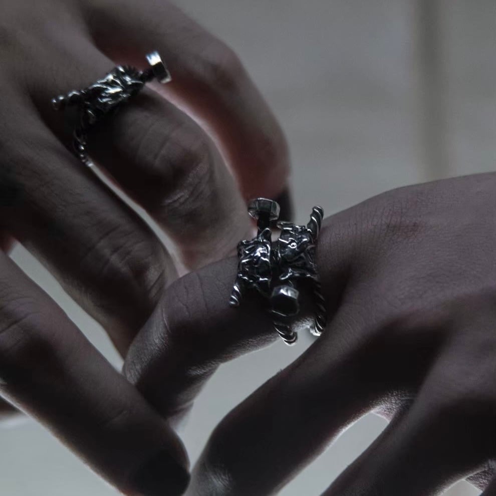 六角ボルトをリング状にした全く新しい造形で手元で存在感を放ちます。