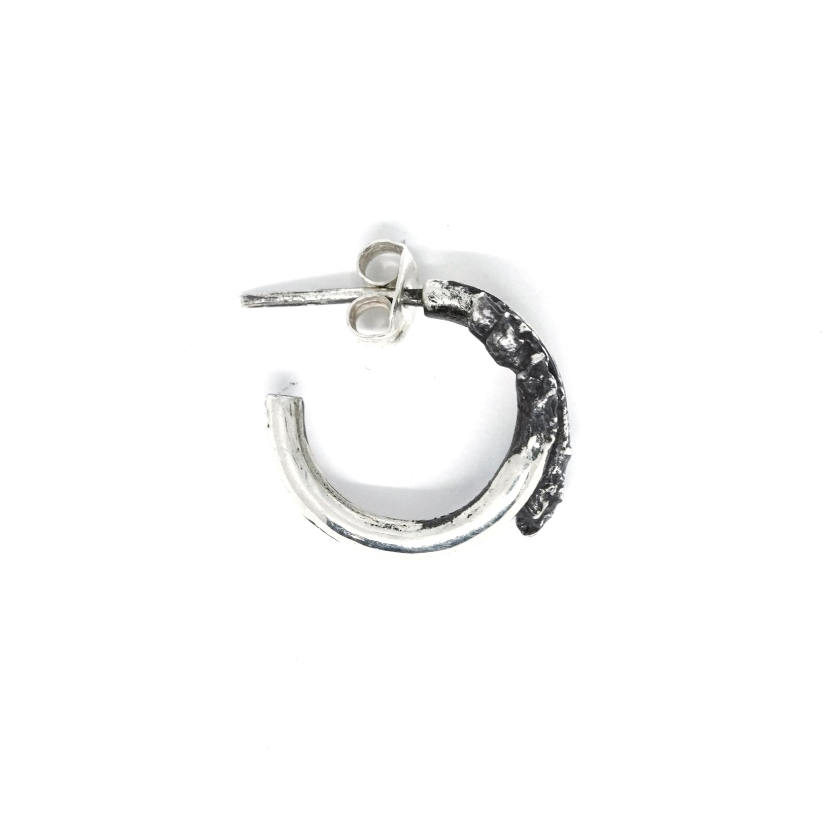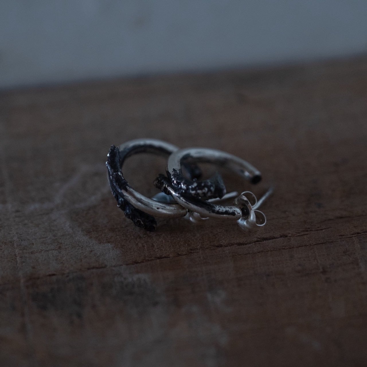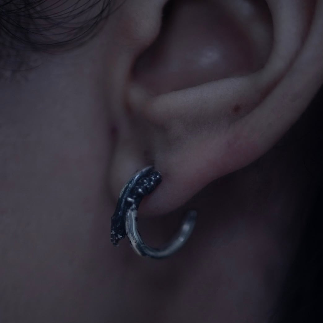 一般的なハーフフープピアスをあえて破壊し、繋げ合わせるデザインにすることで存在感のある一品に。