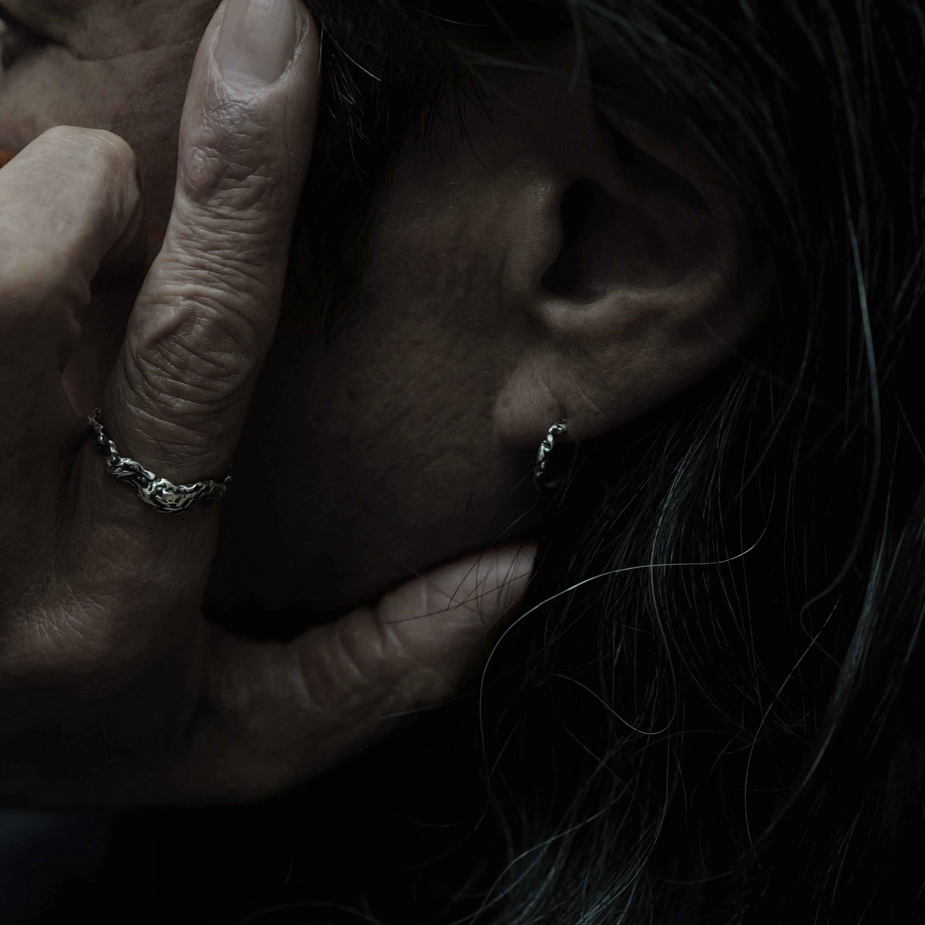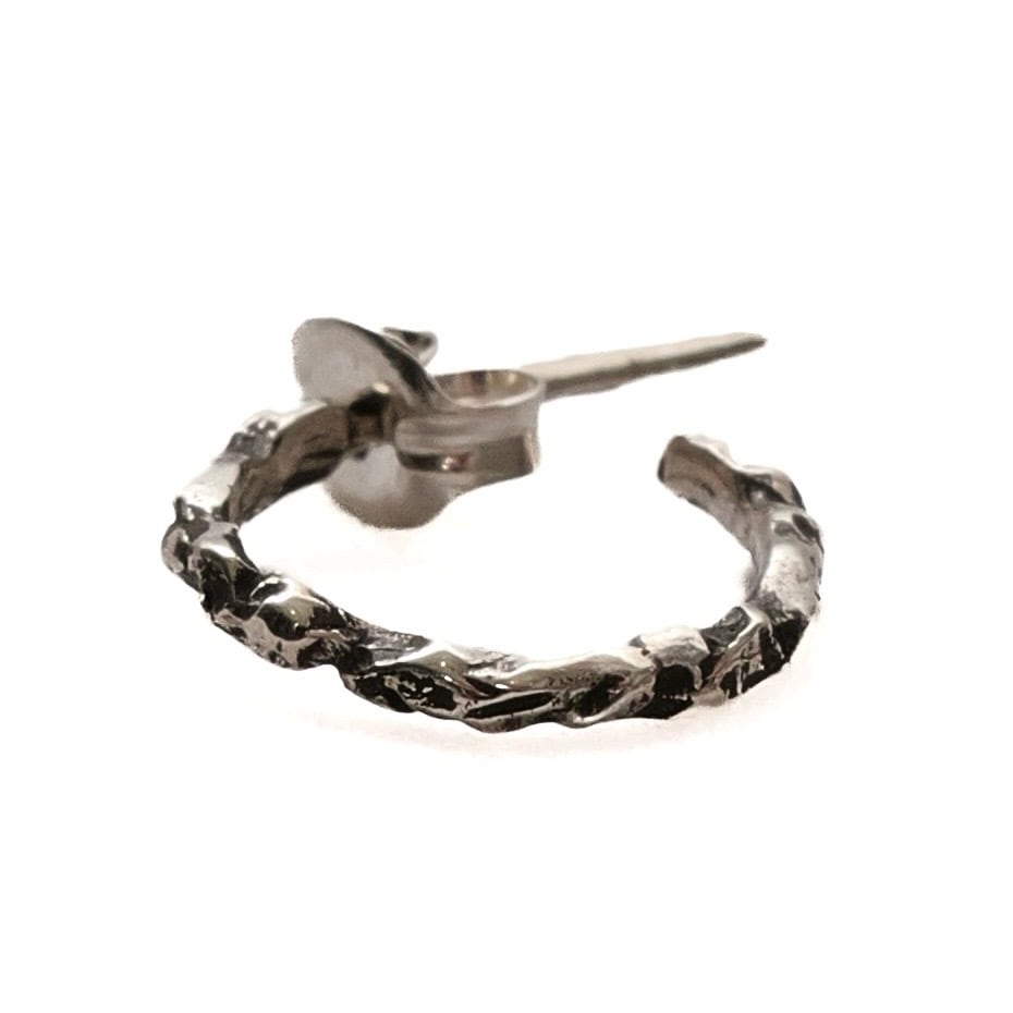 着用すると、細さに反して存在感があり、細いフープに“渋さ”を足すデザインです。